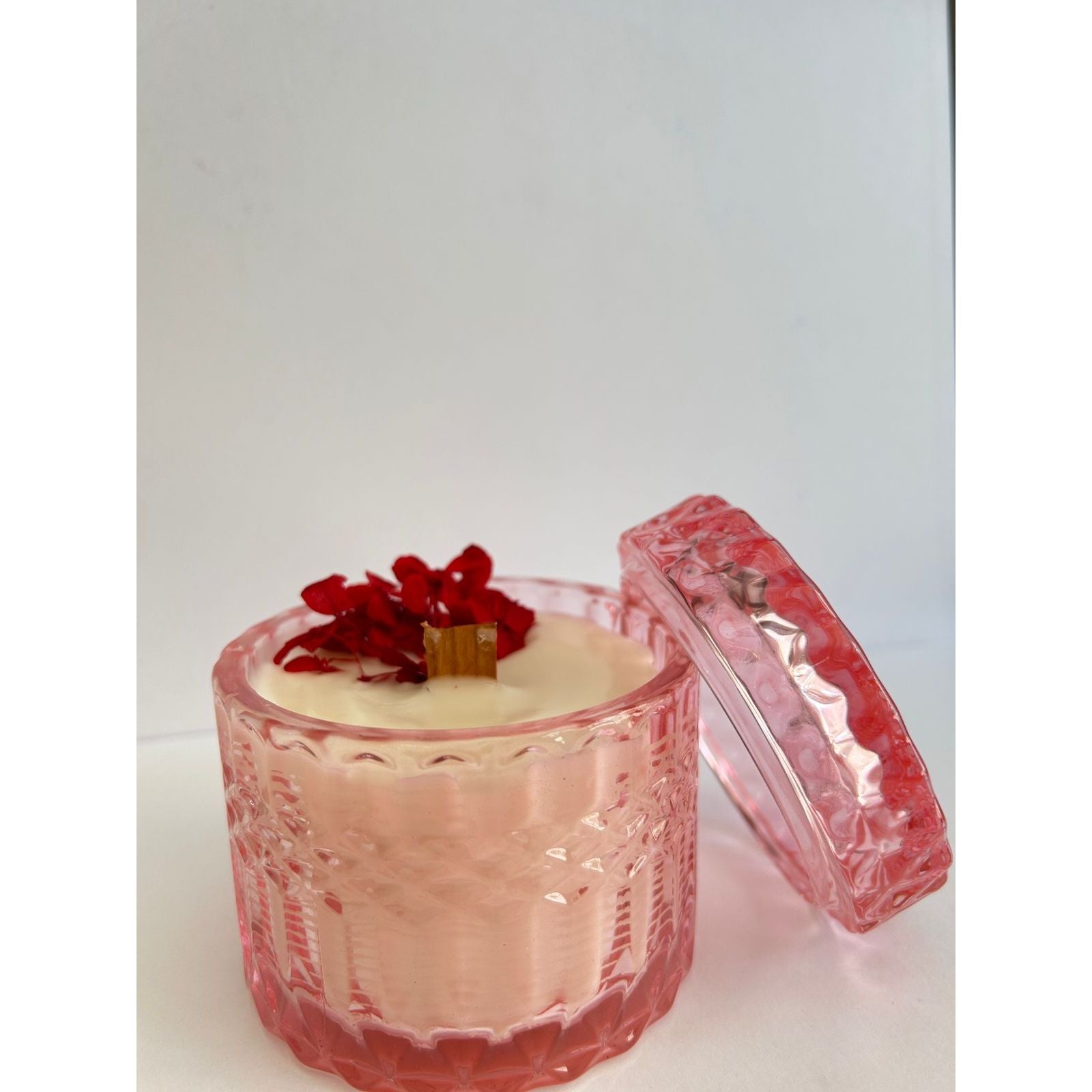 Add a touch of elegance to your space with our handcrafted soy wax candle, beautifully set in a premium rose-red textured glass jar with matching lid. The soft, clean burn releases a soothing fragrance while the chic design doubles as a stylish décor piece.